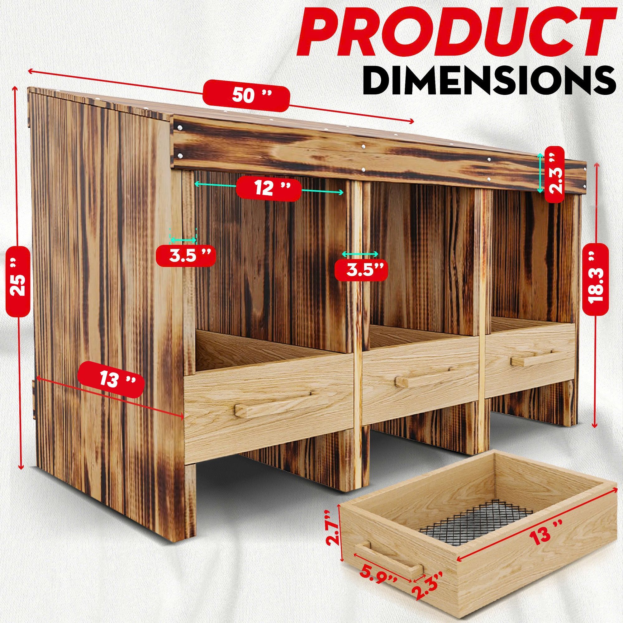 Овај робусни кокошић је изграђен за издржљивост и отпорност на временске прилике. Изграђен је од дрвета од чврстог јела са плочама дебљине од 1,5 цм, пружајући чврст оквир. Спољашње димензије Цоопса су 127 × 33,02 × 63,58цм (дужина × ширина × Висина), нудећи пространу унутрашњост током одржавања компактног отисака погодног за употребу за двориште.