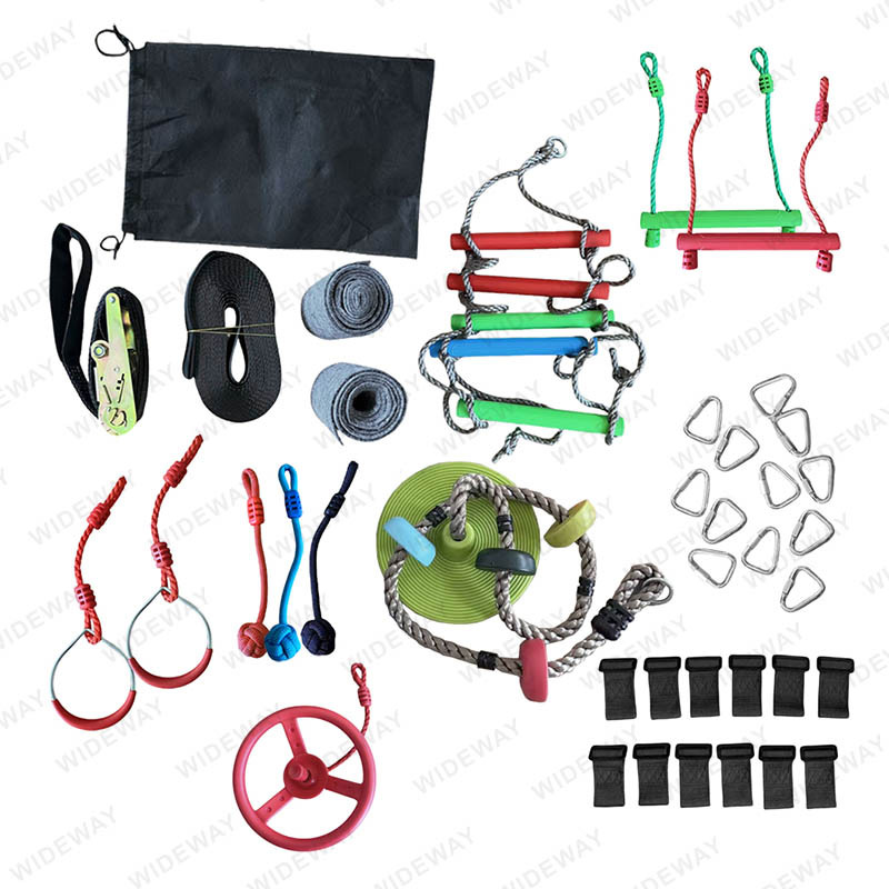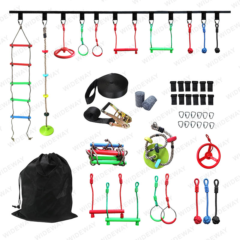 • Укључује 2пцс трапезне шипке, гимнастичке прстенове 2ком, пењачке мердевине и ротирају нинџу точак за разнолику искуство тренинга нинџе.